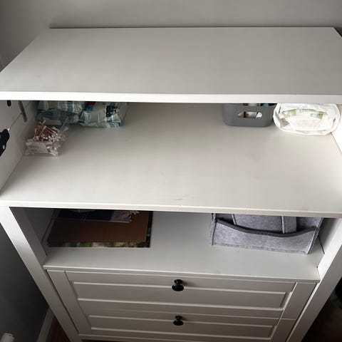 Vit skötbord med skötbordsyta upptill, öppen hylla under samt lådsektion med flera lådor. Möbeln har ben och fronter med ramar samt runda knoppar. Passar för förvaring av blöjor, kläder och andra barnartiklar i barnrum eller sovrum.i väldigt fint skick.kommer från rökfritt och djurfritt hem