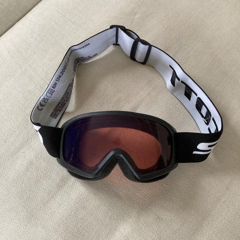 Scott skidglasögon med svart ram och svart/vit justerbar rem med Scott-logotyp. Glasögonen har spegellins med rosa tonad insida. Avsedda för skidåkning eller snowboardåkning och passar tillsammans med de flesta skid- och snowboardhjälmar.