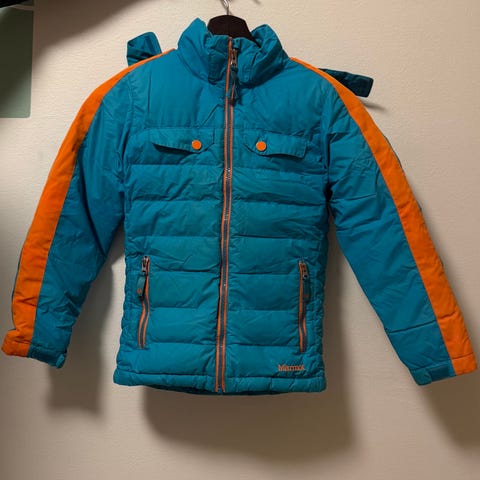 Skogstad dunjacka för barn, unisexmodell i storlek 116. Jackan är grön med blå detaljer och har huva. Fodrad med dun för extra värme. Utrustad med dragkedja framtill och fickor med dragkedja. Passar som ytterjacka under kallare årstider.