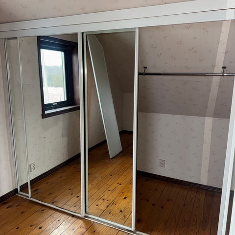 Garderob med skjutdörrar i spegelglas och vit metallram. Flera skjutdörrar täcker hela garderobens framsida och fungerar som helkroppsspeglar. Passar för förvaring i hall, sovrum eller klädkammare där man vill kombinera klädförvaring med spegelfunktion. Golv- och takskenor ingår enligt bild.