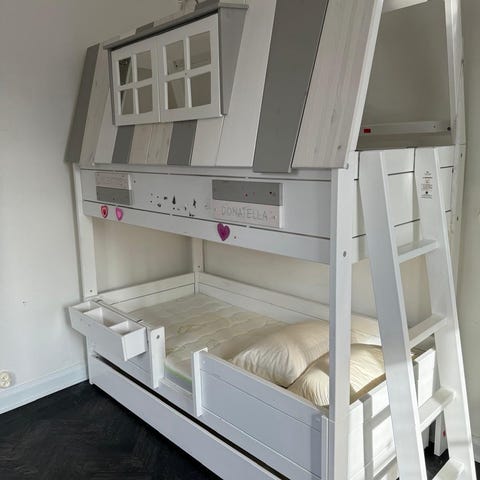 Stabil och säker multifunktionell ZLOYAL10 våningssäng i massiv furu med smart och barnvänlig design. Övre sängen har skyddsräcke för trygg sömn och en integrerad tavla som uppmuntrar kreativ lek. Praktiska förvaringslösningar med två rymliga lådor, trappsteg med förvaring samt två små skåp på sidan gör det enkelt att hålla ordning. Tillverkad i hållbart FSC-certifierat trä och målad med giftfri färg.