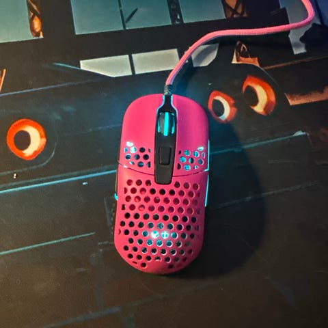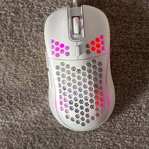 Glorious Model O gamingmus med RGB-belysning. Musen är svart med genombrutet, honungskakemönstrat skal för lägre vikt. Utrustad med kabelanslutning, rullhjul och sidoknappar. Undersidan har glidfötter och perforerad design för ventilation. Passar användning till dator, exempelvis spel och allmän datoranvändning.