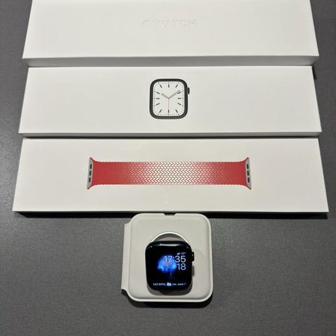 Apple Watch Series 7 smartklocka med GPS. Klockan har svart boett och svart armband. Medföljer magnetisk laddkabel för laddning.