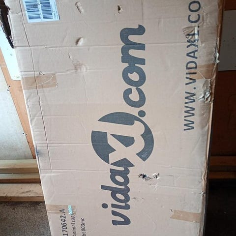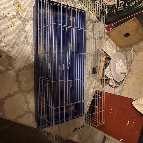 Går att dela på buren, ny vattenflaska, oöppnad toa lätt och strö, öppnat hö.