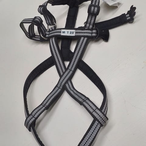 Liten storlek, ca 25 cm halsöppning. Justerbara remmar runt bröstkorgen. Plastknäppena går att låsa så att de inte råkar öppnas.