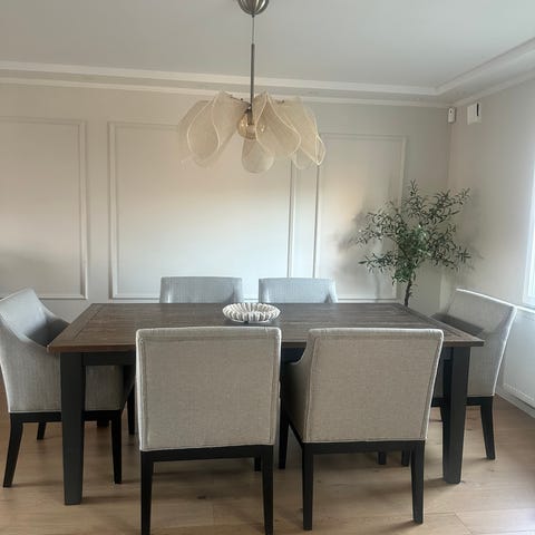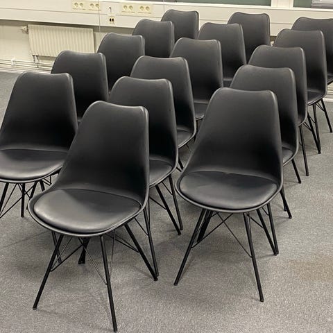 Mio matstol med klädd sits och rygg i grått tyg. Stolen har kromade medarben i metall som ger ett sviktande underrede. Hög rygg för bekvämt sittstöd. Passar som matstol vid köksbord eller matgrupp i vardagsrum.