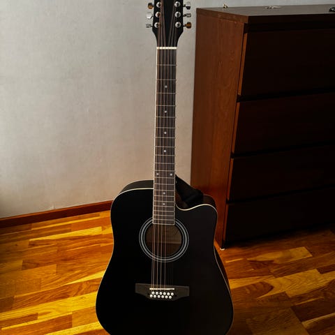 12-strängad akustisk gitarr i naturträutförande. Kropp och hals i trä med ljus lockyta och mörkare sidor och baksida. Gitarren har bandmarkeringar på greppbrädan och standard huvud med tolv stämskruvar. Passar för spel av ackord och kompspel i olika musikstilar där man önskar det fylligare ljudet från en 12-strängad akustisk gitarr.