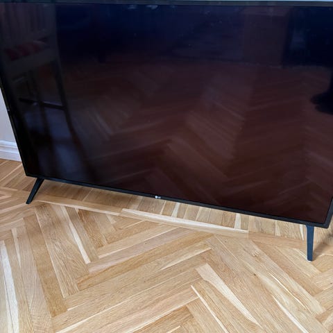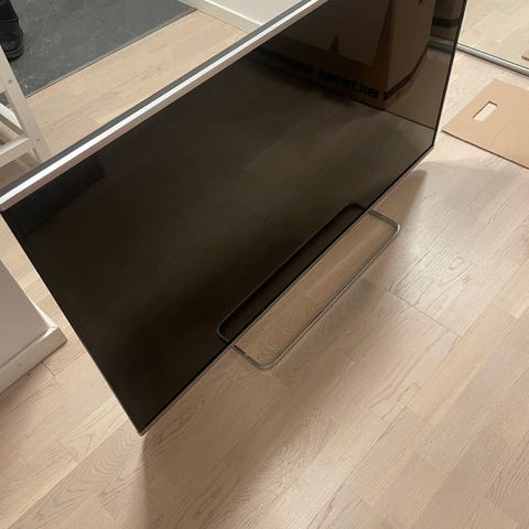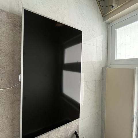 Samsung tv med vit ram och bordsstativ. Tv:n har flera anslutningar på baksidan, bland annat HDMI och andra vanliga ingångar för externa enheter. Passar för användning i vardagsrum, sovrum eller andra utrymmen där en fristående tv önskas.