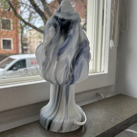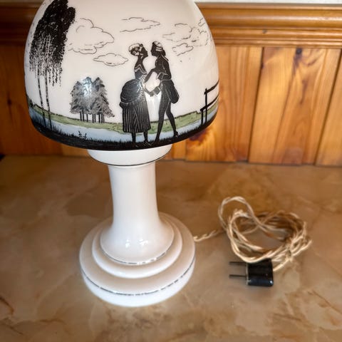 En dekorativ bordslampa med handmålat motiv på glasskiva och en guldfärgad träfot. Unik och vacker från tidigt 1940-tal. Höjd 28 cm. Perfekt som stämningsbelysning i hemmet. Kan skickas med PostNord