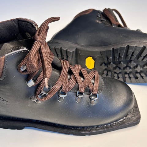 Känga bild 1-3: Arkos - stl EU4, Svarta kängor i läder med röd snörning och kraftig Vibram-gummisula. Tillverkade i Italien. Passar tex till långfärdsskridskor eller turskidor. Skaftet är stabilt och ger stöd för vristen. Passar 75 mm nordic norm - bindning