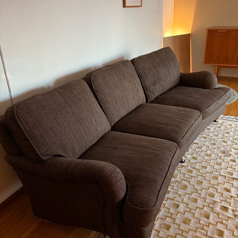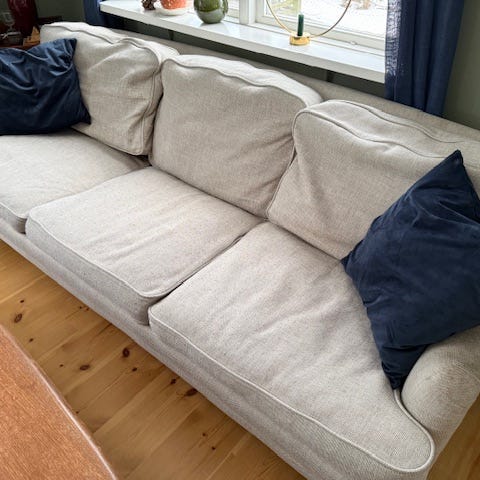 Tvättbar klädsel. Dunkuddar, finns klösmärken från katt på nedre kant av stommen.