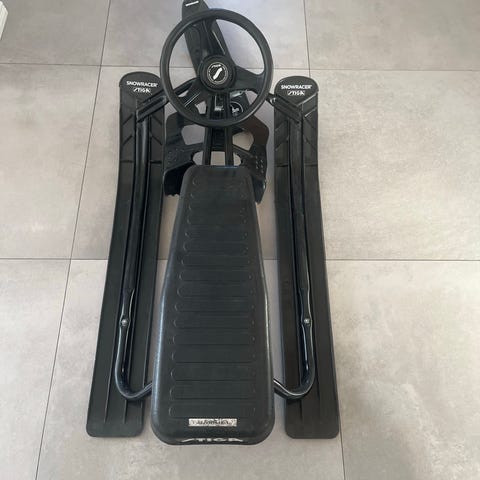 Stiga snowracer pulka i svart och gul färg. Klassisk styrbar kälke med ratt och tre medar. Lämplig för barn för åkning i backe under vintertid. Den har automatisk dragning, mycket praktiskt.