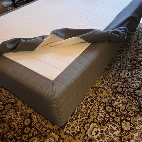 IKEA Skårer resårbotten 140 cm. Resårbotten har grått, kviltat tyg runt sidorna och ben i ek.