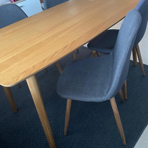 Matgrupp bestående av ett avlångt matbord i vitoljad ek (ser mörkare ut på bild än i verkligheten) med matchande stolar och en skänk/ sideboard. Matbordet har rektangulär, något rundad skiva i vitoljad ek med ben i samma material. Stolarna har trästomme med grå vadderade sittytor och ryggstöd. Skänken/sideboardet är i samma vitoljade ek med tre lådor i mitten samt dörrar på sidorna för förvaring.