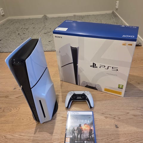 Sony Playstation 5 spelkonsol i vit färg. Konsolen är avsedd för hemmabruk och stödjer moderna PS5-spel samt bakåtkompatibilitet med många PS4-titlar. På bilden syns även två DualSense-handkontroller i olika färger, men endast det som uttryckligen anges i annonsen ingår. Konsolen ansluts till TV eller bildskärm via HDMI och kräver strömförsörjning via medföljande nätkabel vid nyköp. Lagringsutrymme och övriga tillbehör specificeras inte här utan bör kontrolleras separat vid behov.