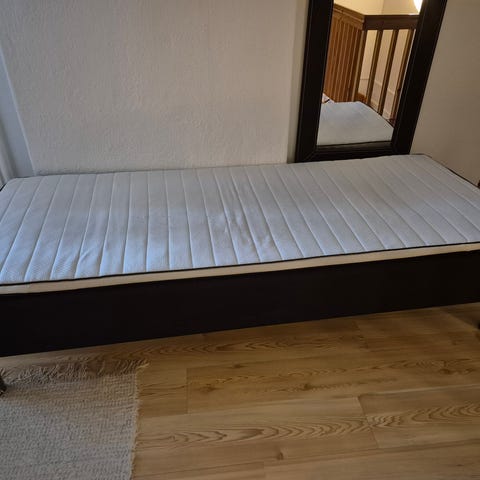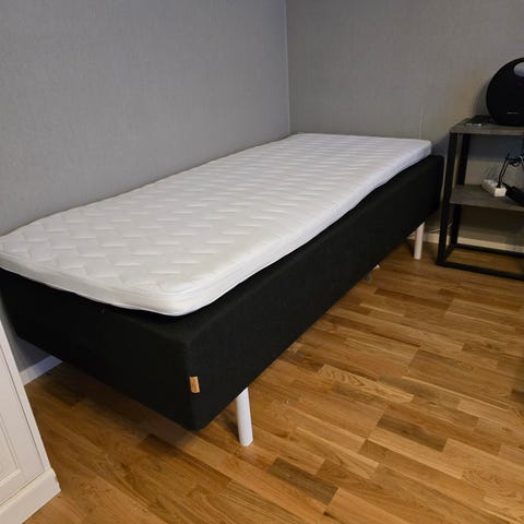 Sängen har grå sängram och träben. Passar som enkelsäng i sovrum, gästrum eller studentbostad. Material är textilklädd ram med träsarg och ben i trä.