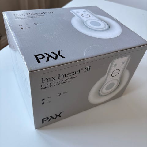Pax badrumsfläkt i vit plast. Avsedd för vägg- eller takmontering i badrum eller andra våtutrymmen. Fläkten har rund front och inbyggd styrning med reglage på ovansidan. Ansluts till elnät via fast installation. Passar för frånluftsventilation i mindre rum där extra luftomsättning behövs.