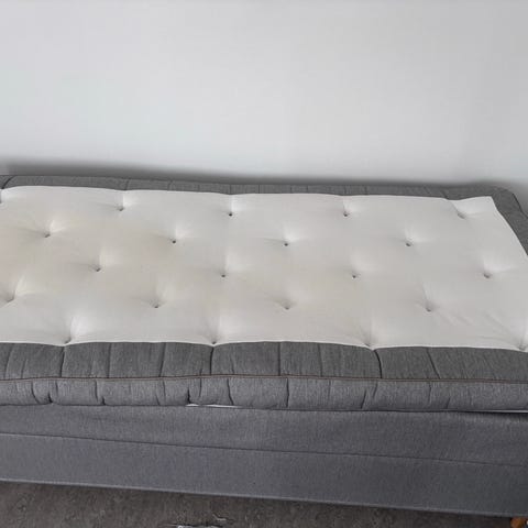 Mio säng med bäddmadrass i grått tyg. Sängen är en enkelsäng med tillhörande bäddmadrass i ljus färg. Passar som säng i sovrum eller gästrum. Tygklädd stomme och huvudgavel i matchande grå kulör enligt bild. Mått 90x200