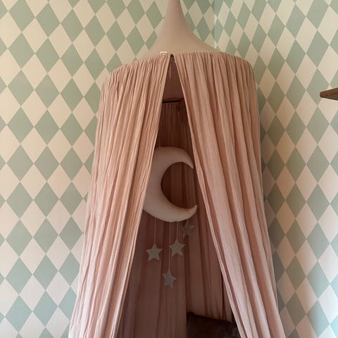 Handgjord sänghimmel i ekologisk bomull och färgen Powder (beige rosa). I varje rum som denna används kommer en sagokänsla att spridas. Perfekt för att inreda barnrummet på ett bra sätt.