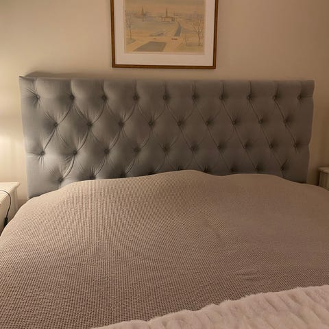 Antracitgrå sänggavel till 180 cm säng med knappar. Står på ben mot golvet, benen är 15 cm och den totala höjden är 120 cm från golvet. Djup 10 cm. Fint skick!