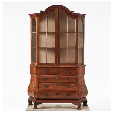 Matgrupp i Rokoko stil bestående av matbord, sex stolar och vitrinskåp. Möblerna är målade i vitt med dekorativa guldfärgade detaljer. Stolarna har stoppad sits med röd klädsel. Bordet är ovalt och placerat på svarvade ben med snidade detaljer med tre iläggs skivor. Skåpet har två dörrar upptill med hyllplan invändigt samt fyra lådor nedtill med metallbeslag. Passar som matgrupp i matsal eller större kök, med tillhörande förvaringsskåp för porslin, textilier eller annan förvaring.