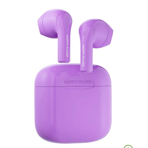 Happy Plugs trådlösa hörlurar i vit marmordesign med gulddetaljer. Hörlurarna levereras med matchande laddningsetui i samma mönster. In-ear-modell med silikonproppar. Passar för användning med kompatibla mobiltelefoner, surfplattor och datorer via trådlös anslutning.