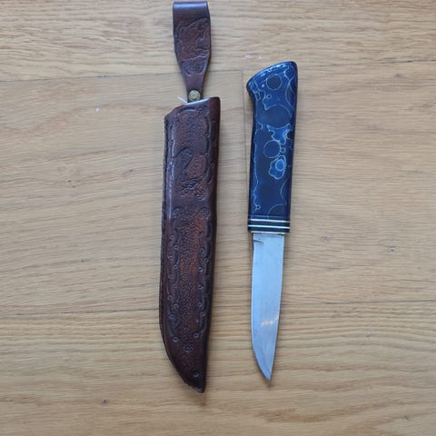 Bladet är fulltänge i kolstål med etsat mönster. Mässinsgstavar. Träslag, oklart.. har glömt namnet. Kniven ligger riktigt bra i handen. Knivslida ingår.
