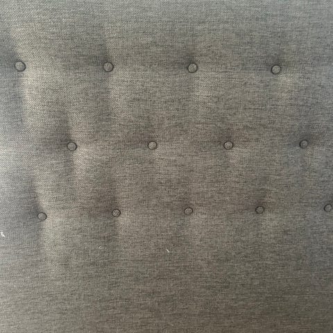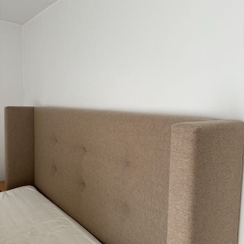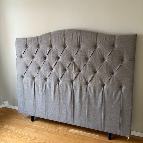 KungSängen sänggavel i grått tyg. Gaveln har vadderad, panelindelad framsida med horisontella sömmar upptill. Passar som huvudgavel till säng och kan användas i sovrum för att ge stöd bakom kuddar och skydda väggen bakom sängen.