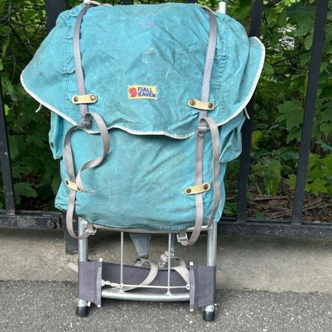 Retro fjällräven ryggsäck i grönt. Sittunderlag följer med. Sparsamt använd och förvarats i ett förråd flera år.