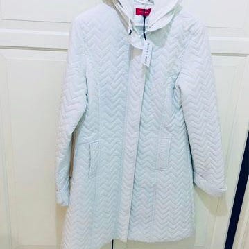 Vinterjacka för dam i storlek M. Jackan är beige och tillverkad i polyester. Modellen har vadderad design med stora framfickor och dragkedja framtill. Fast huva med äkta avtagbar pälskrage.