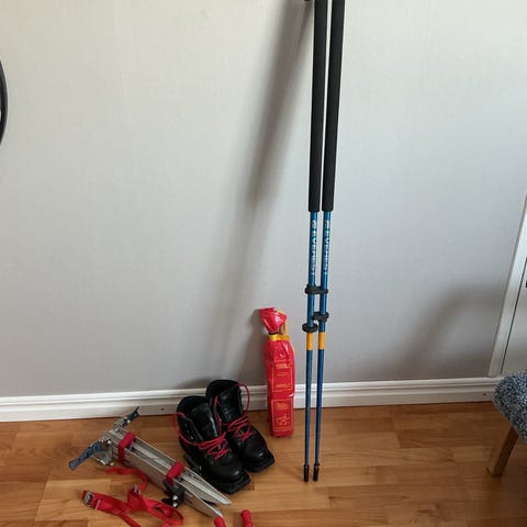 Lundhags skridskoutrustning för övriga skridskor. Setet inkluderar Lundhags kängor i storlek 44 i svart läder med röda skosnören, skridskoskenor med remmar, räddningslina, stavar samt ispik i fodral. Utrustningen är avsedd för tur- eller långfärdsskridskoåkning och passar för användare som behöver robusta kängor och komplett grundutrustning för åkning på naturis.