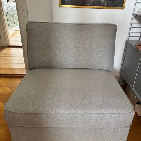 Bäddfåtölj NORODDEN ljusgrå från Jysk. Tygklädsel. Fåtöljen görs enkelt om till en säng. Sits och ryggkudde i skum.