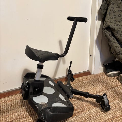 Bugaboo ståbräda med sits till barnvagn som har brukats med bugaboo fox. Ståbrädan fästs bakom barnvagnen och ger ett extra stå- eller sittutrymme för ett äldre barn. Utrustad med hjul framtill och fästen baktill för montering på kompatibel Bugaboo-vagn. Sitsen är avtagbar och ståytan är räfflad för bättre fotfäste. Lämplig för kortare och längre promenader när ett extra barn behöver åka med på vagnen.