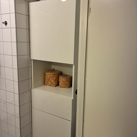 Vitt högskåp med dörr från ikea modell HAVBÄCK med handtag (se bild) ca 1 år gammalt. 3 hyllplan i glas + 3 hyllplan i trä.