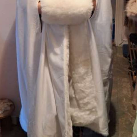 Vit brudkappa i one size. Kappan har huva och lång, svepande modell som täcker klänningen väl. Den är framtill försedd med knytband vid halsen. Passar som ytterplagg över brudklänning eller festklänning vid utomhusvigsel eller andra högtidliga tillfällen i svalare väder. Finns i Uppsala.