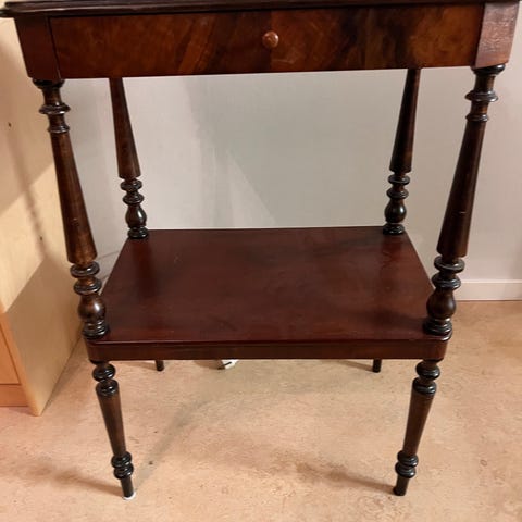 Sidobord i trä med ett övre bordsskiva, en låda under skivan samt två öppna hyllplan. Svarvade ben i trä. Passar exempelvis som avlastningsbord eller liten förvaringsmöbel. En del patina. Nyckel finns och låset fungerar.