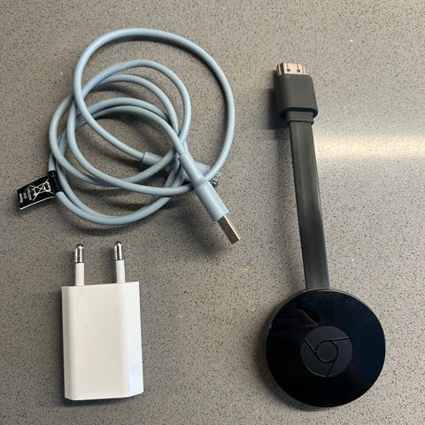Google Chromecast mediaspelare i svart färg. Enheten ansluts till TV:ns HDMI-ingång och drivs via medföljande nätadapter och USB-kabel alternativt direkt från USB porten i tv:n. Används för att strömma bild och ljud från mobiler, surfplattor och datorer till TV:n via wifi. Lämplig för hemmabruk där man vill spela upp digitalt innehåll på en större skärm.