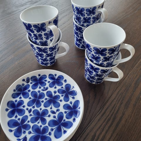 Rörstrand porslin tallrikar och muggar i vit färg med blått mönster. Servisen består av 4 tallrikar, 4 muggar samt 1 skål.