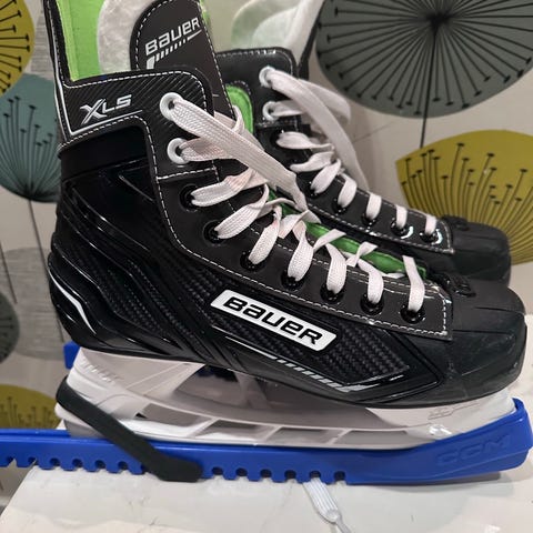 Bauer XLS ishockeyskridskor i svart med gröna detaljer. Klassisk snörning framtill och vit plastskena med stålblad. Modellen är avsedd för ishockey och allmän skridskoåkning på is. Passar för användare som söker ett par grundläggande ishockeyskridskor med stöd runt fotled och häl.