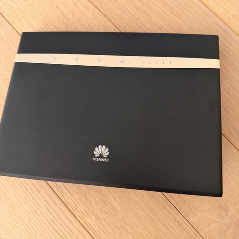 Huawei B715-23C router i vit färg. Stationär router med flera nätverksportar på baksidan för anslutning av trådbundna enheter. Enheten har indikatorlampor på framsidan för status och uppkoppling samt medföljande nätadapter enligt bilderna. Lämplig som central nätverksenhet i hem eller mindre kontor där man behöver dela internetanslutning mellan flera enheter.