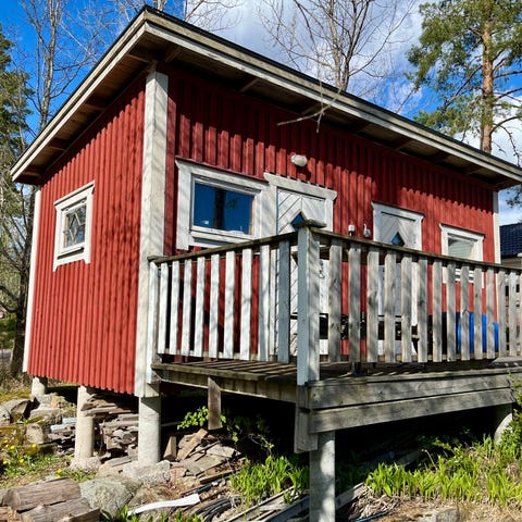 Två rum, veranda, altaner, uthus och roddbåt ingår.