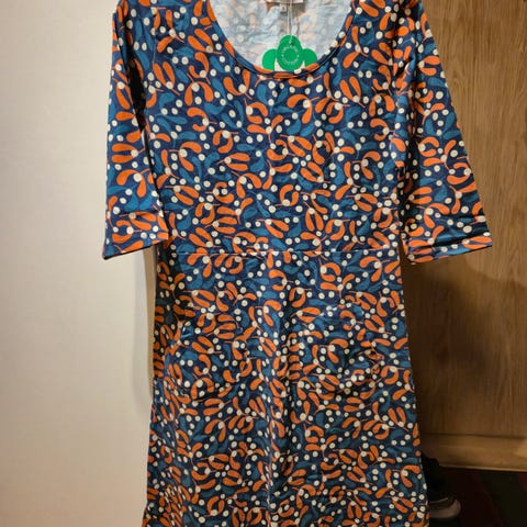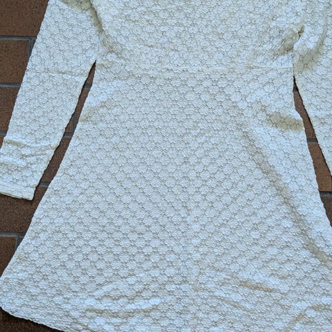 Handgjord stickad klänning för dam i storlek S. Klänningen är beige och stickad i ull. Den har lång ärm och mönsterstickning på ärmar och kjoldel. Modellen har lätt utsvängd kjol och rundad halsringning med diskret kant. Passar som vardags- eller stickad klänning under svalare årstider.