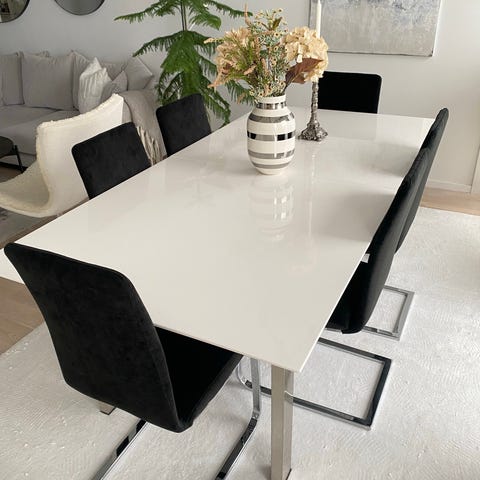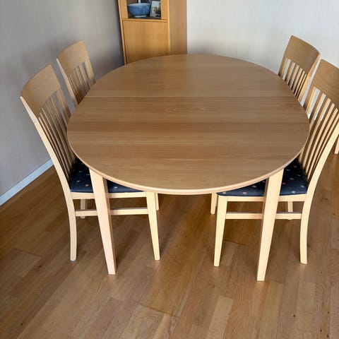 Matbord med 6 stolar plus två iläggsskivor så kan bli rejält långt.