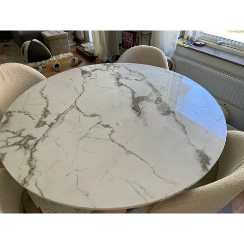 Tyvärr är ytan flammig för att lacken inte tål varmt, bästa vore att slipa om och lacka om eller ha duk, därav det låga priset.