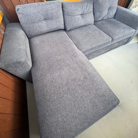 Mått: Längd 226cm, bredd: 88, höjd: 88cm. Bredden på liggytan ca 145cm. Med förvaring i schäslongen. Finns i centrala Varberg, 2:a vån utan hiss.
