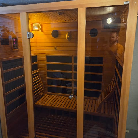 Harvia bastu med integrerad duschkabin. Bastun är utrustad med Harvia-aggregat och bastustenar. Invändigt finns sittbänkar i trä samt träpanel på väggar och tak. Duschdelen har glasvägg och skjutdörrar, handdusch och blandare. Enheten är avsedd för installation i badrum eller liknande utrymme där både bastu och dusch önskas i samma kabin.