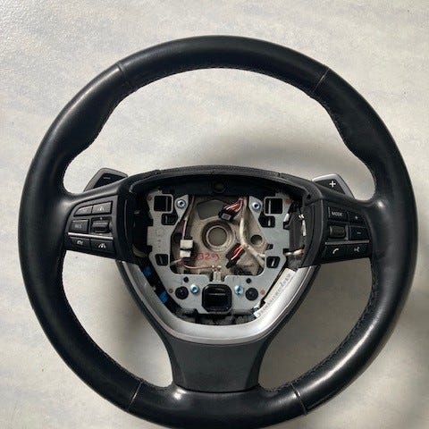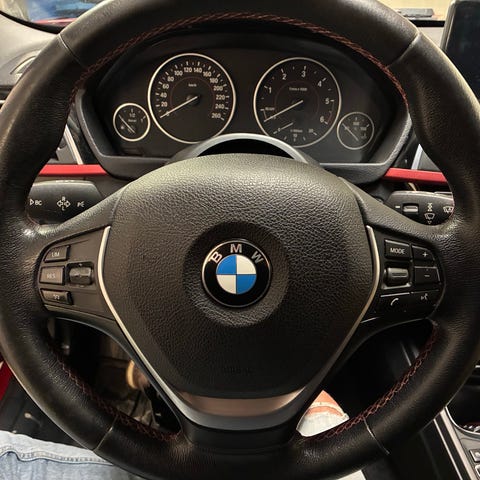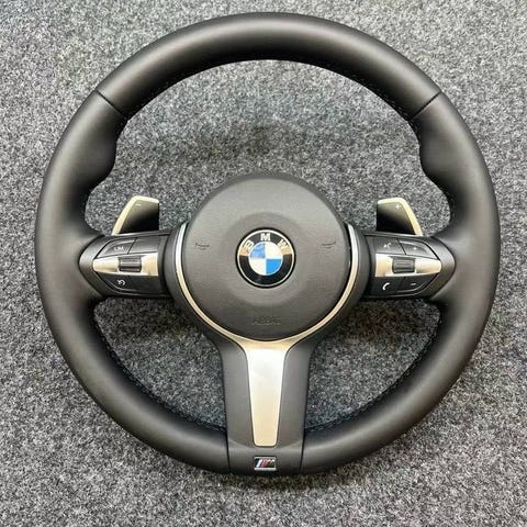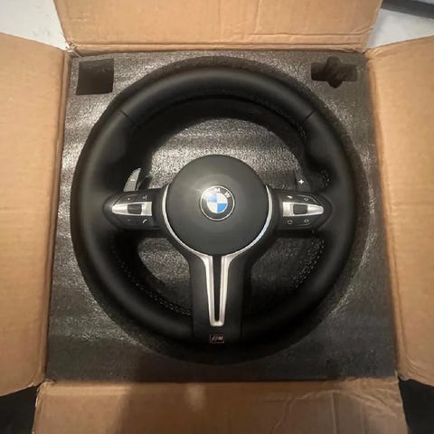 Ny ratt i svart läder med sömmar i M-färgerna. Rattkåpa i svart pianolack utan knappar. Rattknappar kan flyttas över från befintlig ratt av samma modell.