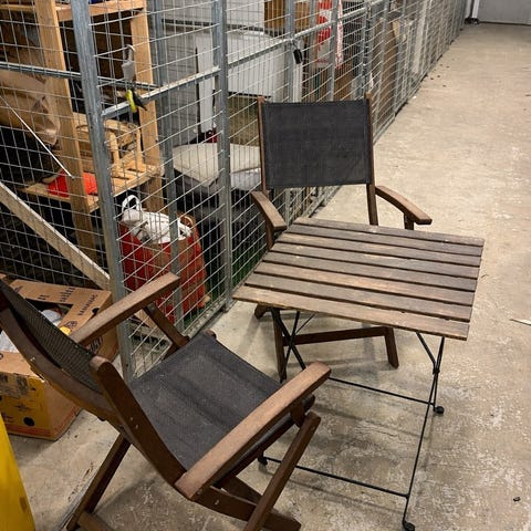 Stabil svart metallbänk med sittdynor, hopfällbar.