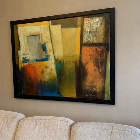 tavlor väggdekorationer med blandade motiv. En större abstrakt tavla i svart, vitt och beige toner med svart ram. En mindre stillebenmålning med frukt och kanna i dekorativ guldfärgad ram. Två smala rektangulära väggdekorationer med religiösa motiv i metalliknande guldton, monterade i mörk träram. Passar som väggdekoration i till exempel vardagsrum, hall eller sovrum.