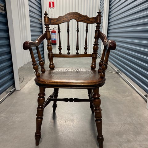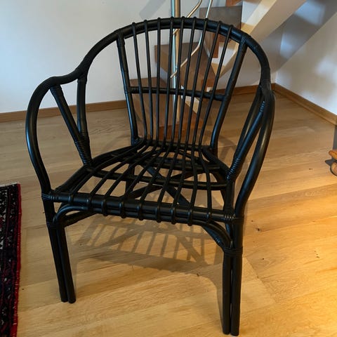 Stol med armstöd i trä med sits och ryggstöd i rotting. Stolen har en naturfärgad trästomme med raka linjer och snedställda ben. Sits och rygg består av flätad rotting som ger ett luftigt uttryck. Passar som matstol, skrivbordsstol eller fristående fåtölj i vardagsrum eller sovrum.